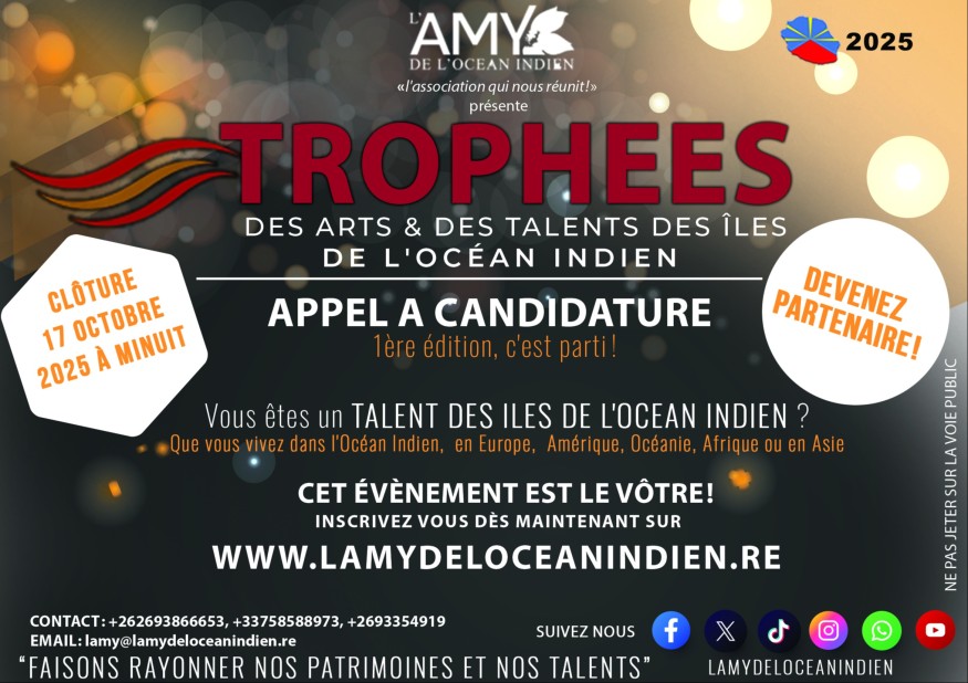 Et si on célébrait enfin ce que nos îles ont de plus beau : leurs talents, leurs histoires et leur créativité ?C’est exactement ce que propose L’AMY de l’Océan Indien avec la première édition des Trophées des Arts & des Talents des Îles de l’Océan Indien.
