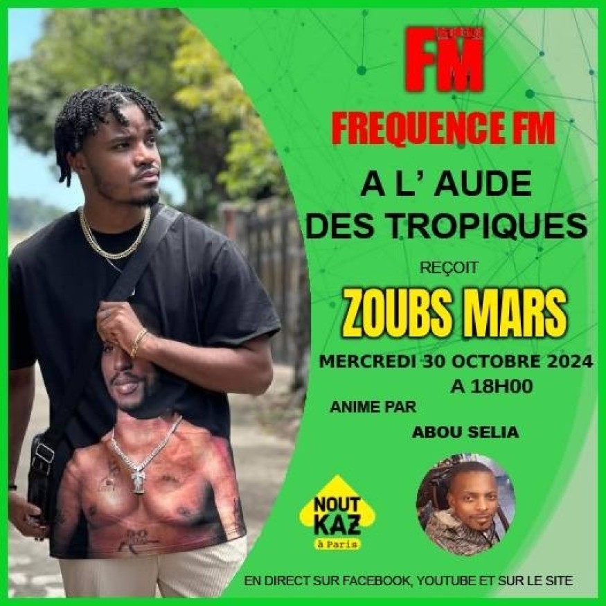 Ce mercredi 30 Octobre 2024, À l’Aube des Tropiques vous invite à plonger dans l'univers de Zoubs Mars, l'artiste comorien qui enflamme les scènes et s'apprête à conquérir la France ! Après avoir ému le public aux Comores, il débarque pour une tournée exceptionnelle où il interprétera ses titres phares comme Zigelegele, Tsipara et Whadi.