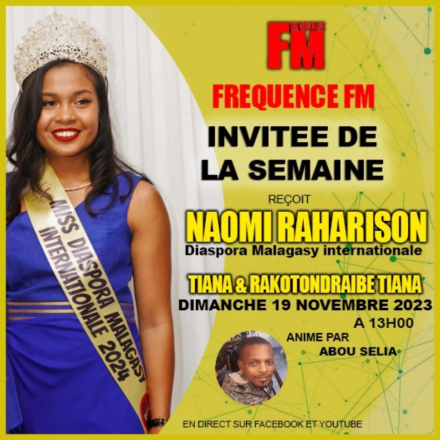 Découvrez les invitées de la semaine :Miss Naomi Raharison, Miss Diaspora Malagasy internationale 2024, Mme Tiana, la présidente du COP à l'île de la Réunion et Mme Rakotondraibe Tiana, la vice présidente de l'association Dera France qui serons avec nous pour nous parler le projet de l' Association Dera France et du 5ème anniversaire de Miss Diaspora Malagasy.