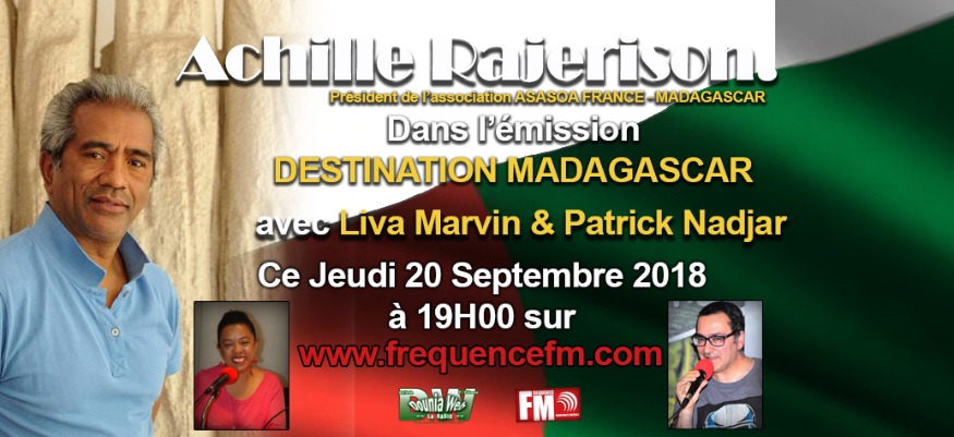 Ce jeudi à 19h00, l'équipe de destination Madagascar accueillera Mr Achille Rajerison - Présindent de l'association ASASAO FRANCE - Madagascar. Emission présente par Liva Marvin & Patrick Nadjar.